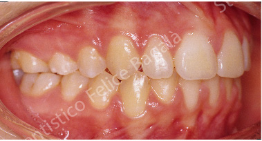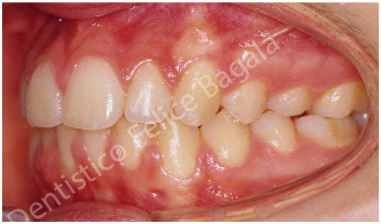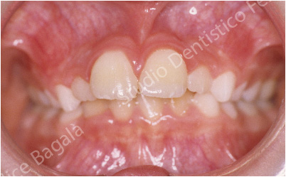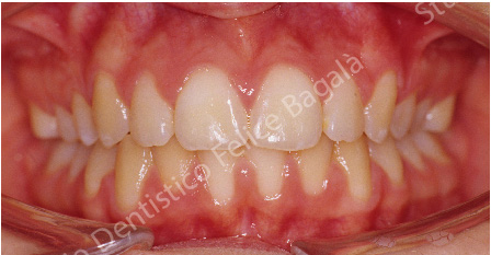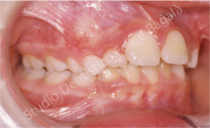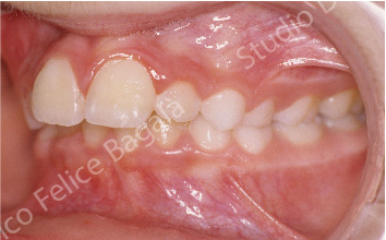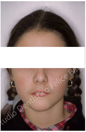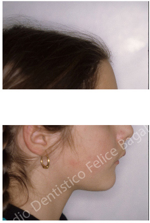 Caso di II classe, trattata con apparecchio mobile, con crescita in deficit dello scheletro mandibolare (parte inferiore). Ha una apparente “sporgenza superiore” con denti in fuori: In realtà è un mento indietro. Basta guardare il miglioramento sulle foto di profilo, dove a fine crescita ha un viso nettamente più bello. Se non fosse stata curata avrebbe potuto sviluppare problemi di vario genere nel corso della sua vita, ma soprattutto sarebbe stata una adolescente senza sorriso.